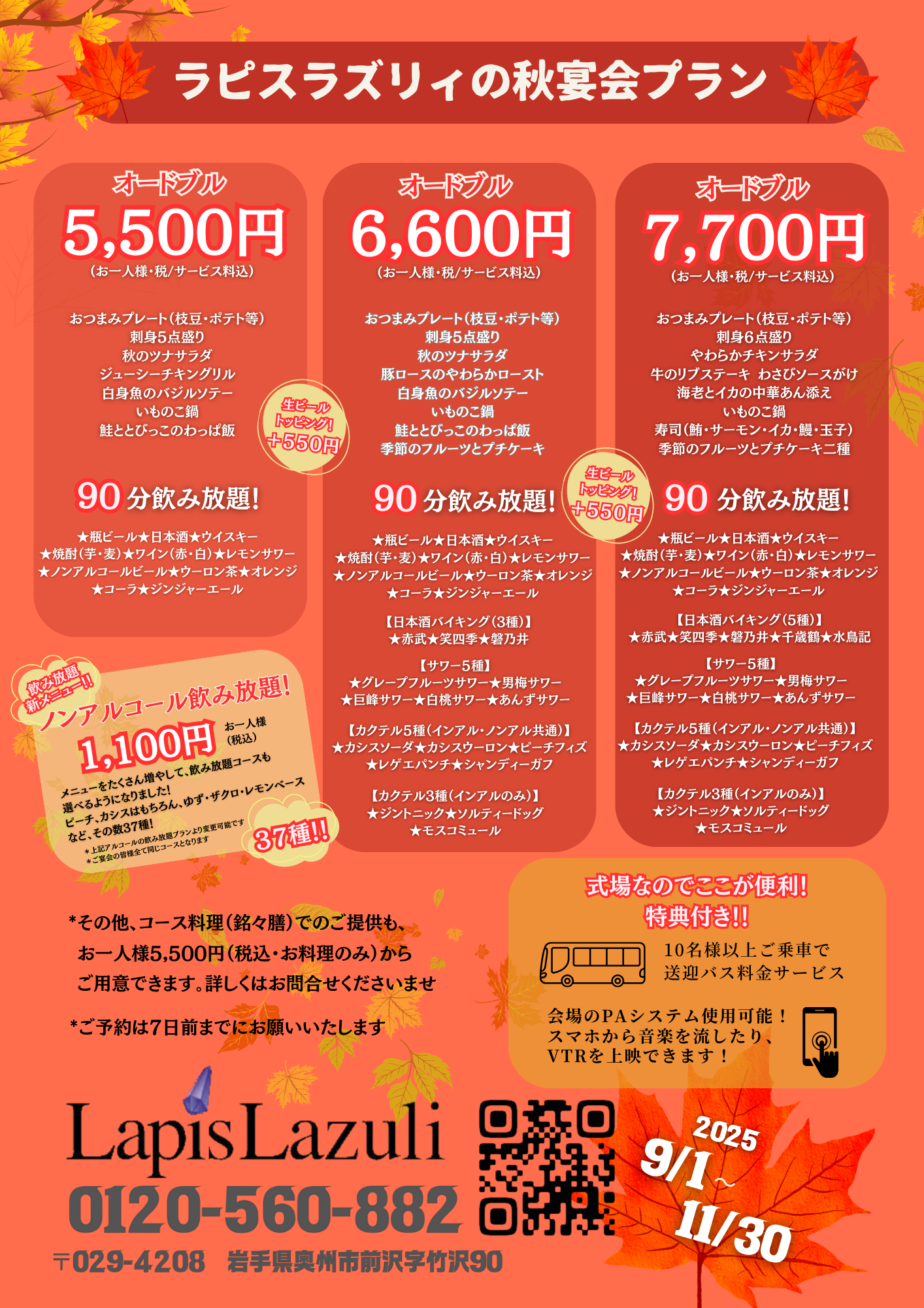 【ラピス・ラズリィの秋宴会!】 9/1~11/30までのご宴会プラン!
