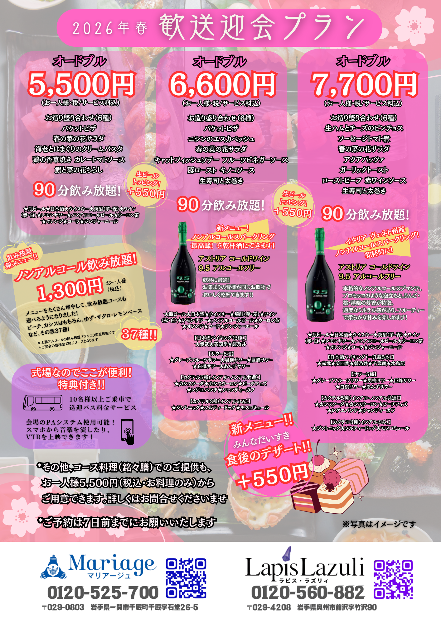 生ビール飲み放題」「食後のデザート」などのオプションもある!